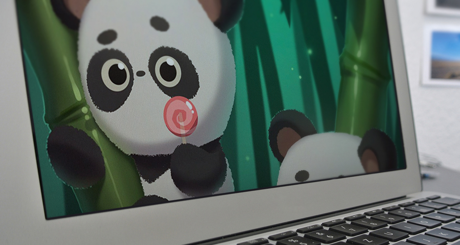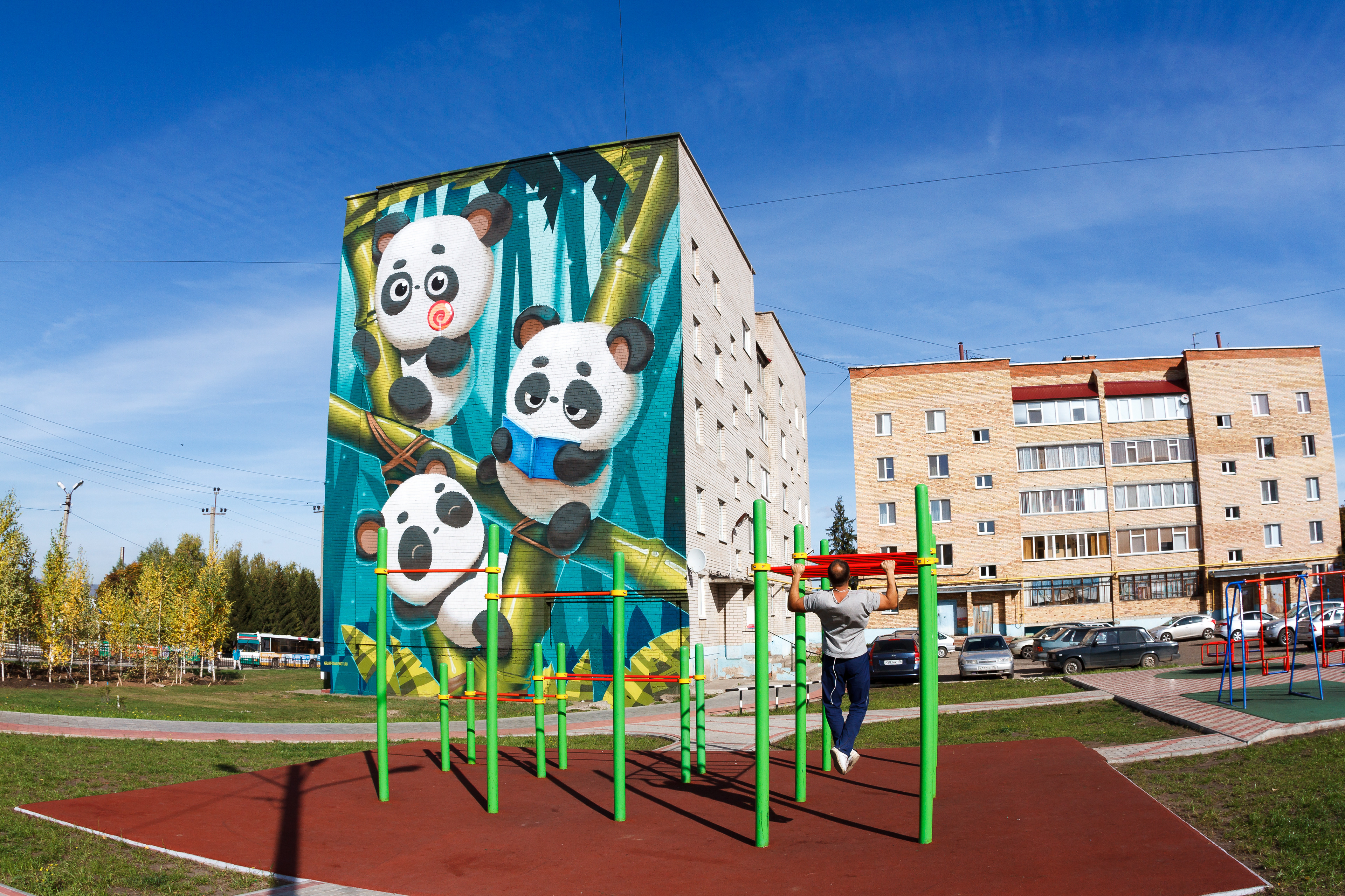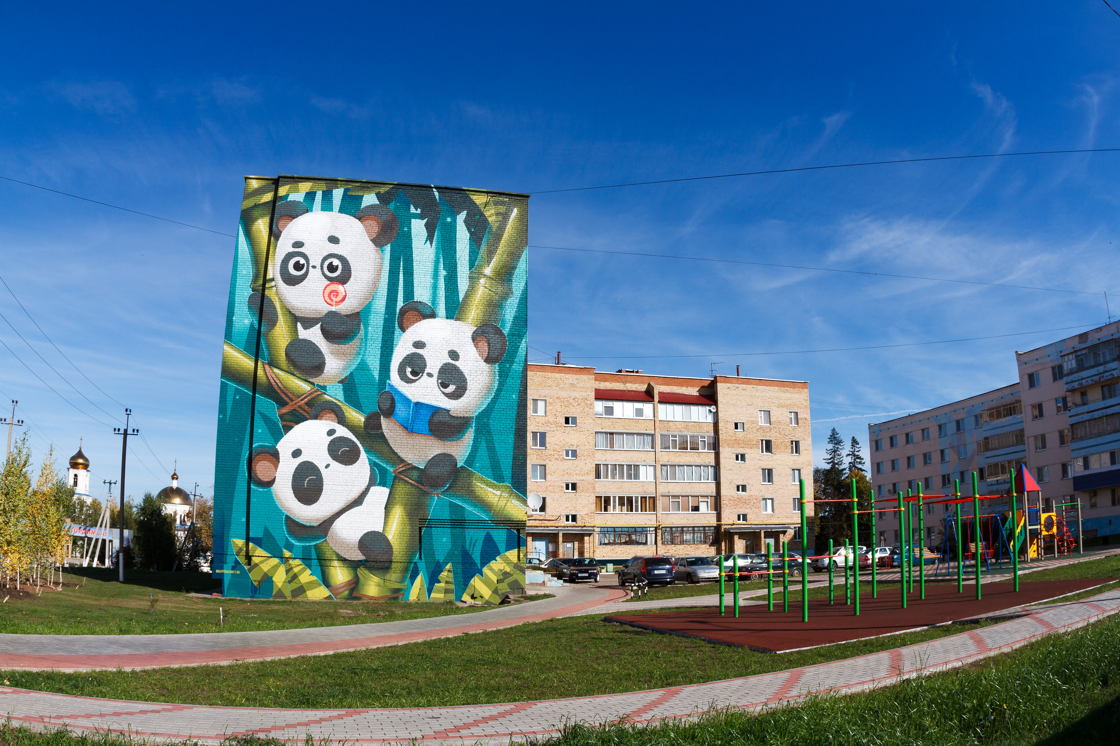 Mural "Big Cute Pandas" made as like greeting card for the anniversary of the city